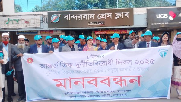 বান্দরবানে ‘দুর্নীতির বিরুদ্ধে তারুণ্যের একতা: গড়বে আগামীর শুদ্ধতা’ এই প্রতিপাদ্য নিয়ে মঙ্গলবার (৯ ডিসেম্বর) আন্তর্জাতিক দুর্নীতি বিরোধী দিবস ২০২৫ উদযাপন করা হয়। দিবসটি উদযাপনের লক্ষ্যে দুর্নীতি দমন কমিশন